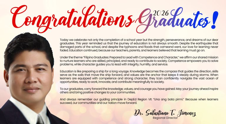 MESSAGE Greetings of Celebration! Today we celebrate not only the completion of a school year but the strength, perseverance, and dreams of our dear graduates. This year reminded us that the journey of education is not always smooth. Despite the earthquake that damaged parts of the school, and despite the typhoons and floods that came continue reading : MESSAGE-FOR-SOUVENIR-PRORGAM-END-OF-SCHOOL-YEAR-RITE-SY-2025-2026